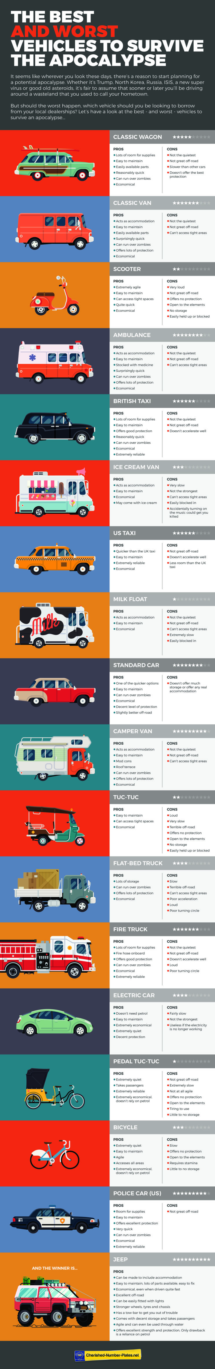 Another day, another risk to world stability it seems. Be ready for the apocalypse in whatever form it may come knowing the pros and cons of various vehicles, so you don’t waste time gassing up a dud.