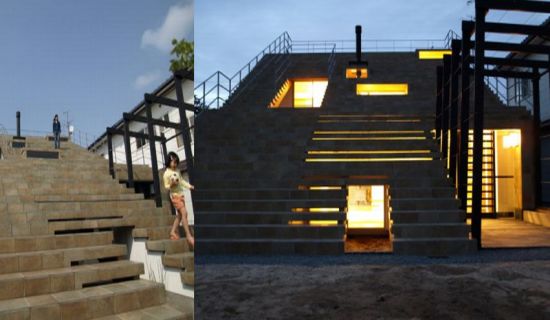 Posted by staff / September 5, 2010This house in Shimane, Japan, uses an innovative take on how roofs are designed: the roof is made of a climbable staircase. Looking close to a section of a stadium, the house is known as Kaidannoie—that is, Stairs House.