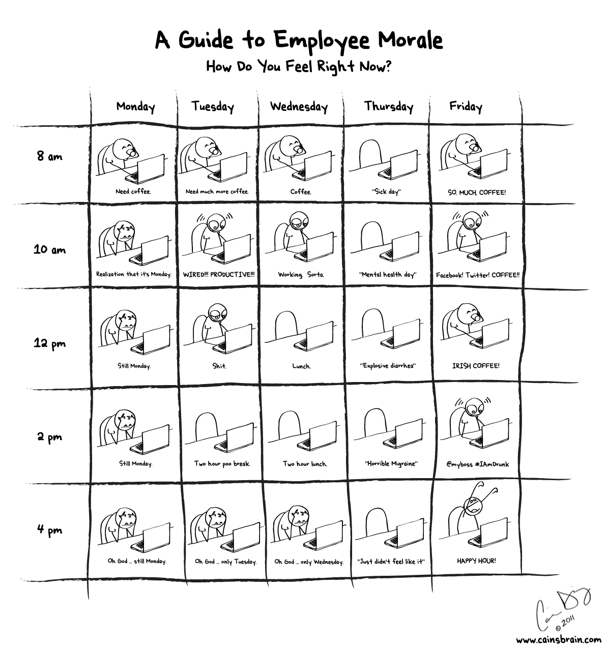 The employee morale chart [comic] Posted by staff / August 18, 2011 Full story at Cain’s Brain via I love charts. Surviving the work week. Share Aug/18/11 Comments are off for this post.
